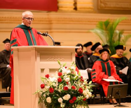 Dean Harrington addresses the audience at the 2025 commencement ceremony on May 15. Photo credit: Amelia Panico.